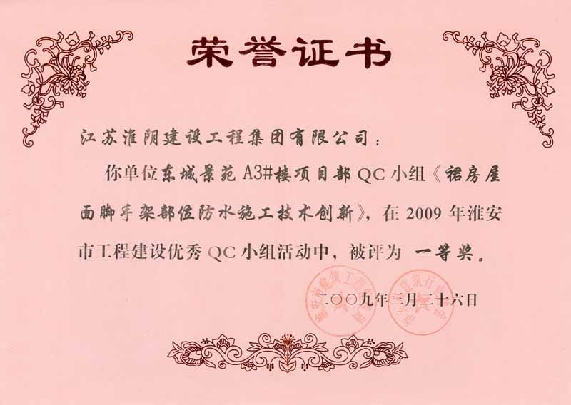 2009年市QC一等奖(东城景苑A3#楼项目部-裙房屋面脚手架部位防水施工技术创新)