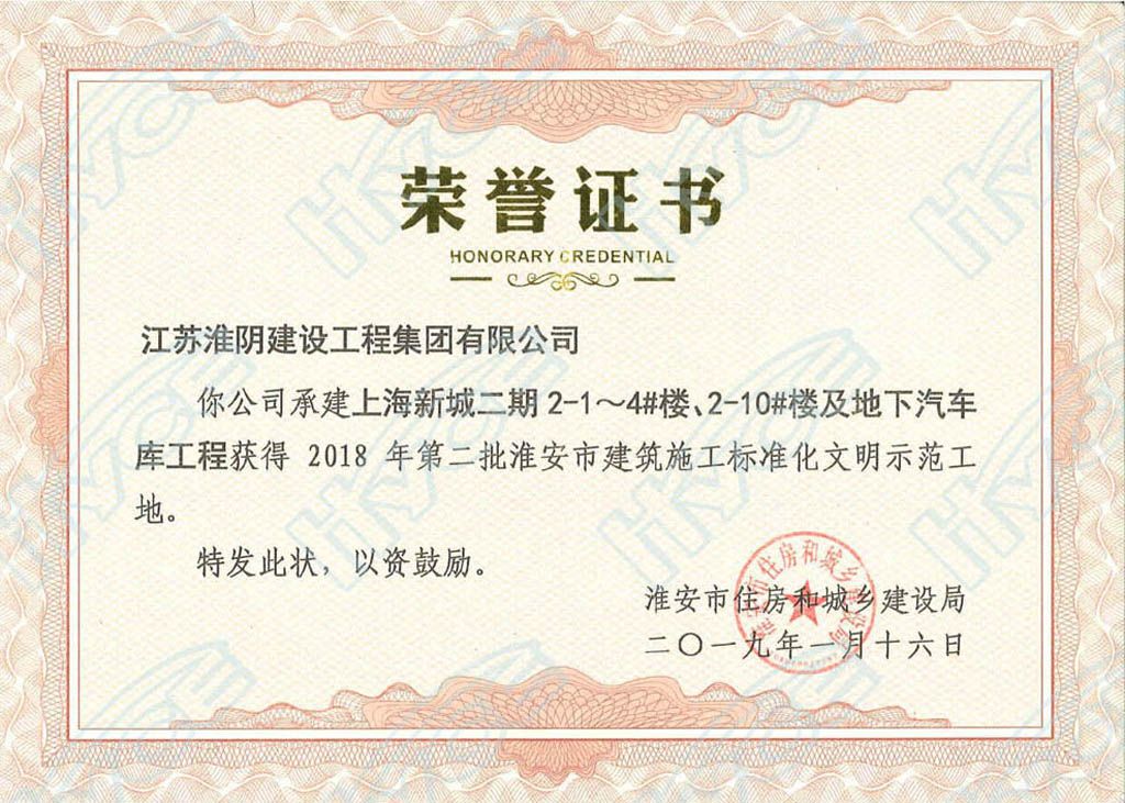 淮安市建筑施工标准化文明示范工地-上海新城二期2-1~4#楼、2-10#楼及地下汽车库工程